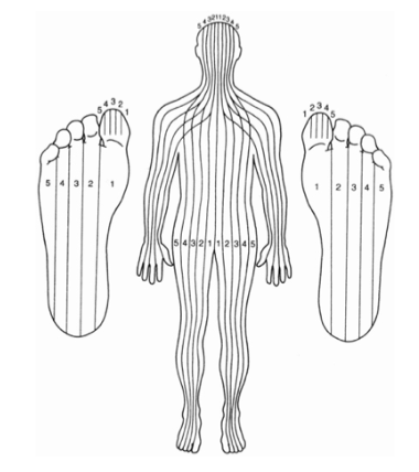 Au début du XX siècle, Dr William Fitzgerald annonce le début de la réflexologie moderne par la thérapie zonale. Il sera le premier à tracer la première carte montrant les lignes longitudinales de l’énergie circulant au travers du corps.